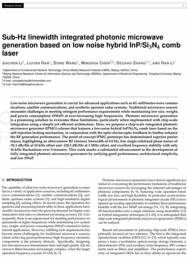 其商酌服从“Sub-Hz linewidth fully integrated photonic microwave generation based on low noise hybrid InP / Si₃N₄ comb laser”被光学限度顶级学术期刊 Photonics Research 请托(影响因子 7.2,中科院 1 区 TOP)。