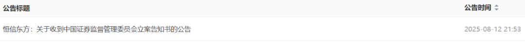 恒信东方文化股份有限公司(以下简称“公司”)于2025年8月12日收到中国证券监督贬责委员会(以下简称“中国证监会”)下发的《立案奉告书》(编号:证监立案字0142025029号),因涉嫌信息败露犯罪违纪,把柄《中华东谈主民共和国证券法》《中华东谈主民共和国行政处罚法》等法律法规,中国证监会决定对公司立案。