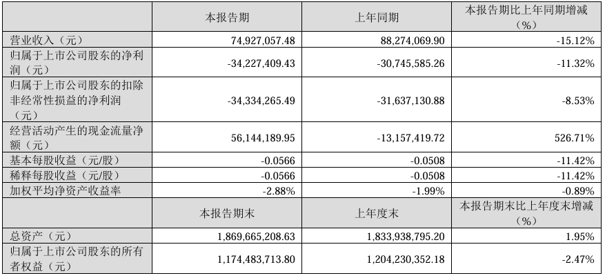 2025年一季度,公司营收7492.71万元,同比着落15.12%;归母净利润-3422.74万元,同比着落11.32%;扣非净利润-3433.43万元,同比着落8.53%。