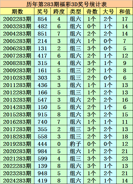 积年第283期福彩3D同时奖号为:854 - 482 - 851 - 214 - 131 - 417 - 315 - 161 - 303 - 436 - 166 - 547 - 150 - 915 - 740 - 355 - 558 - 444 - 984 - 599 - 139 - 948 - 419。