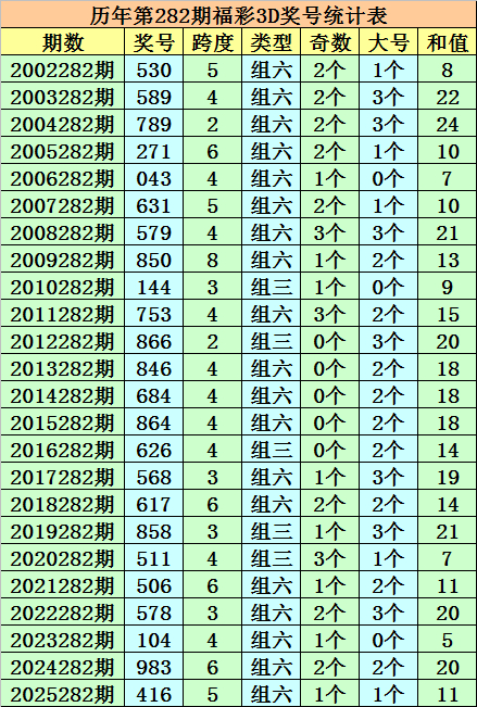 在以上奖号中奖,积年第283期福彩3D出现1次豹子,出现7次组三,出现15次组六。组六开出比例较高,本期链接调理组六。